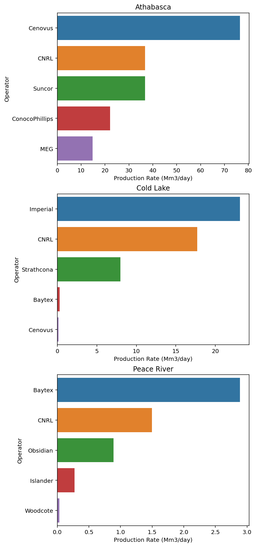 sns.barplot(x = 'Production_Rate', y = 'Operator', data = bitumen_agg.query("Area == @area"), ax = ax[i])