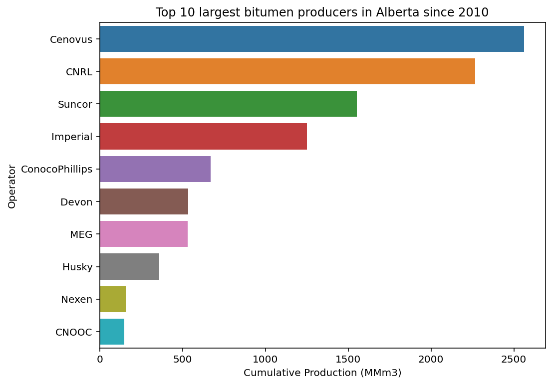 # Plot the top 10 largest bitumen producers in Alberta since 2010